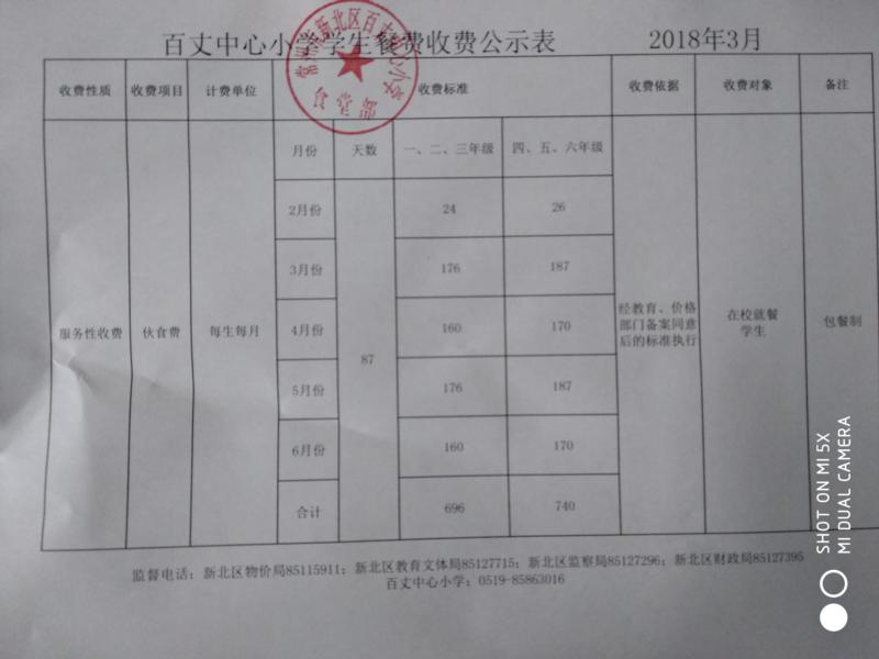 百丈小学学生餐费收费公示