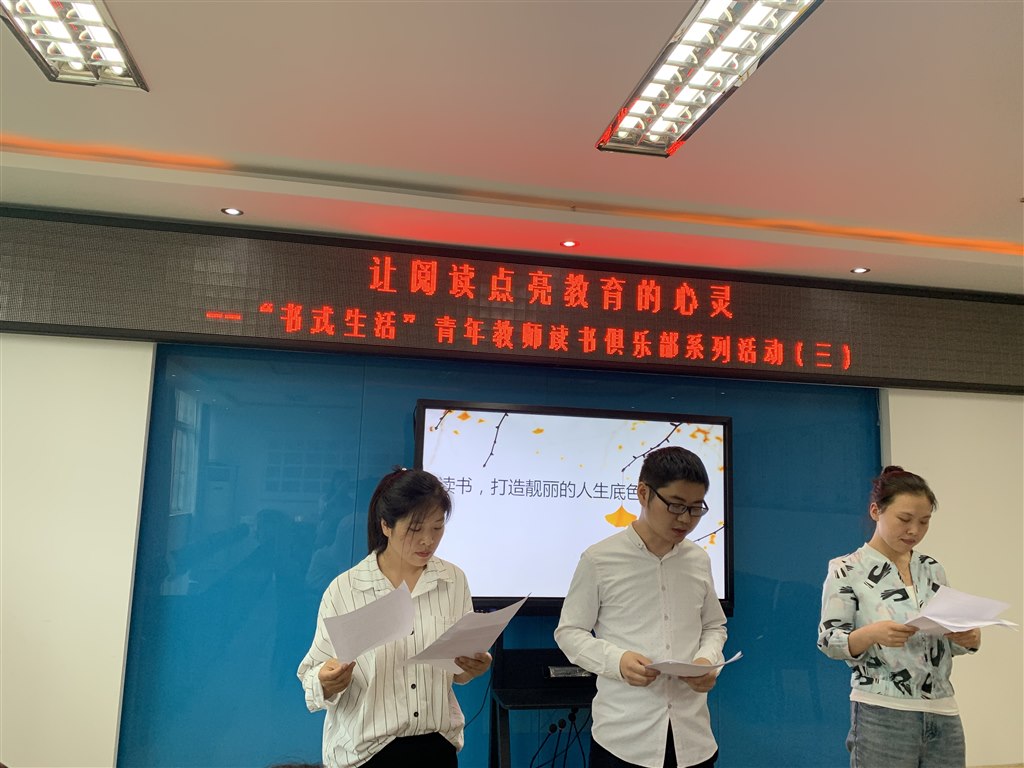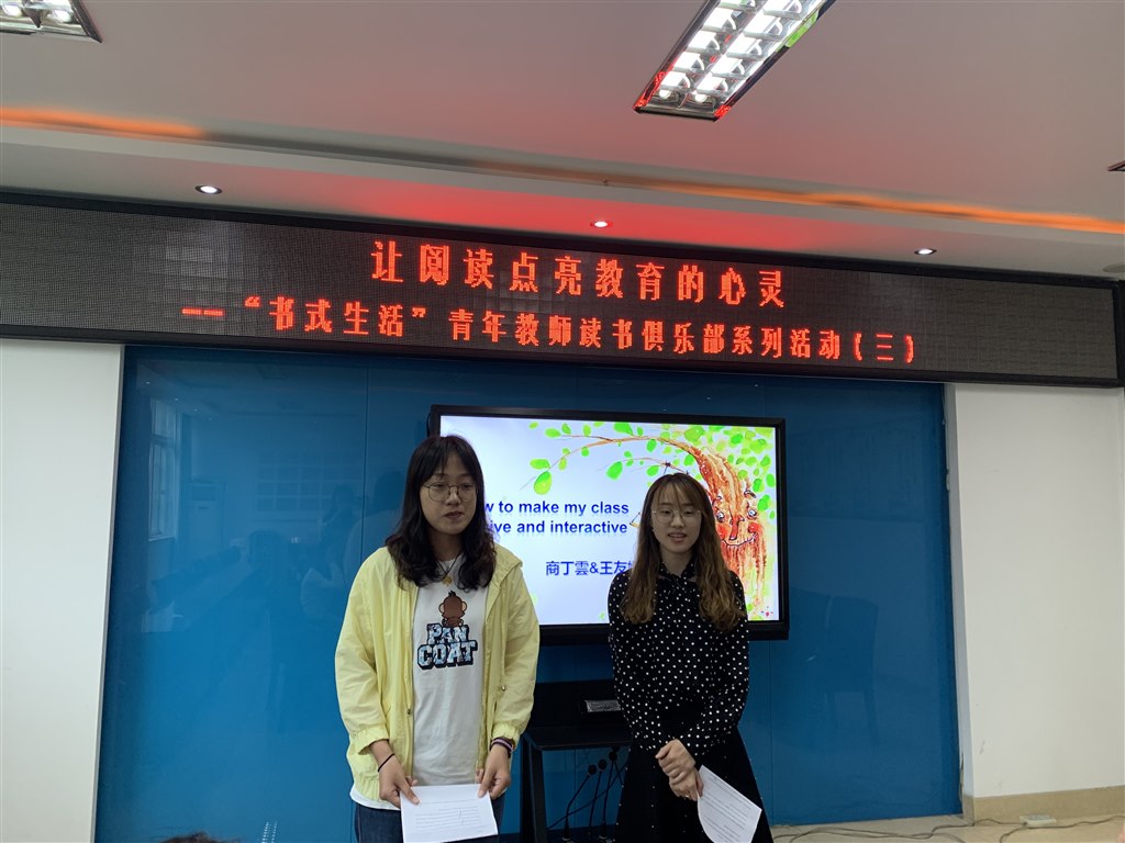 轻柔的音乐缓缓流淌,俱乐部成员们静下心来,围绕“阅读与教育”主题,结合学科组阅读书目与个人教育经历,倾吐了自己与书的故事。朱高红老师以张三同学为例,声情并茂的给我们讲述了苏霍姆林斯基“赏识教育”对她的影响,我们不能改变教育的长度,但却能改变我们教育的深度;“付出的努力才是我们最好的奖赏”,教师应当宽容、豁达,在阅读中寻找本真,这是刘琪儿和黄嘉楠两位老师从《第56号教室的奇迹》中觅得的真理;面对调皮、吵闹的孩子,我们该怎么办呢?徐芳、陈玲燕、翟绵纬三位老师从《心平气和的一年级》中为我们找到了答案,如荷花般坚守本真,不落与俗,不呵斥、不怒视,培养孩子的静气;同读一本书,沈茜和颜敏敏两位老师却有不一样的收获,颜老师读出了教学中王国维的三境界,沈老师则扎根课堂,寻求学生的自能自得,主动学习,这或许就是读书的魅力吧;读书,还可以打造靓丽的人生底色,张白雪、潘青、刘开东三位老师从名家作品中汲取力量,获得前进方向,将所得得心应手的运用到教育教学、班级管理之中;商梦婷老师从王崧舟老师的教育叙事中深受启发,语文没有唯一尺度,要引导学生说出自己的想法,给生命生长无限可能;“How to make my class active and interactive”全英文的演讲令人眼前一亮,商丁雲、王友娜两位老师精心准备,浅谈了自己对创设有趣课堂的无限想法。