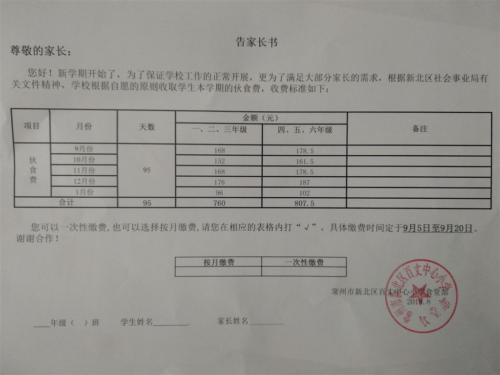 2019-2020第一学期百丈小学学生餐费公示
