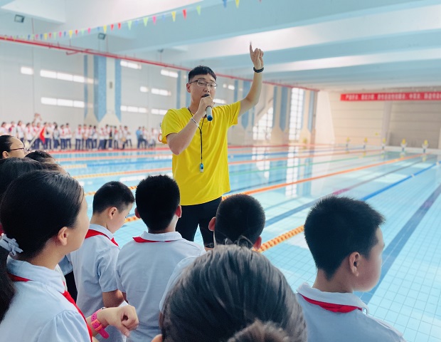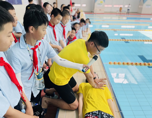 上午8点30分,六年级全体师生列队出发,一路上在百丈派出所民警的护送下安全到达了春江镇全民健身中心,在工作人员的指引下上午9时六年级全体师生来到了游泳馆,四位教练已经等候多时。首先,教练通过真实的案例引导孩子们认识到溺水的危险性,以及掌握自救本领和如何救人的重要性。教练指出对于不会游泳的人落水时,要沉着冷静切勿慌张,尽量做出仰泳的姿势,把鼻子和嘴巴露出水面,保持正常的呼吸;而遇到别人落水时则需要大声呼救或就地取材,用木棍或竹竿拉住溺水者同时降低自己的重心。接着,两名教练亲身示范了落水时救人方式和技巧,并且示范操作了营救溺水者必备技能之一---- 心肺复苏术,把握“黄金4分钟”。尽管时间不长,但是在短短的一小时里孩子们收获了很多重要“防溺水”安全知识,这样的切身体验比在书本上、视频中看到的知识要深刻不少。活动最后,孩子们用热烈的掌声向几位教练表示了衷心的感谢。