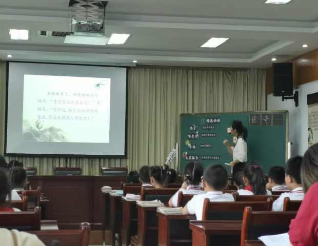 首先,由徐芳老师带来的一年级《棉花姑娘》,徐老师精心准备了棉花的实物,一下子吸引了学生们的兴趣也拉近了他们与文本之间的距离。徐老师还充分利用各式的视频、音频,让学生了解棉花、七星瓢虫,学生学习的津津有味。课堂中徐老师教学了多种识字方法,比如自主识字“别”,字源识字“医”“病”,偏旁部件识字“棉”等,生字教学十分扎实。而且朗读教学从词到句,先正音,再释义,最后朗读。还让学生们分角色朗读,一下子将课堂氛围拉向高潮。
