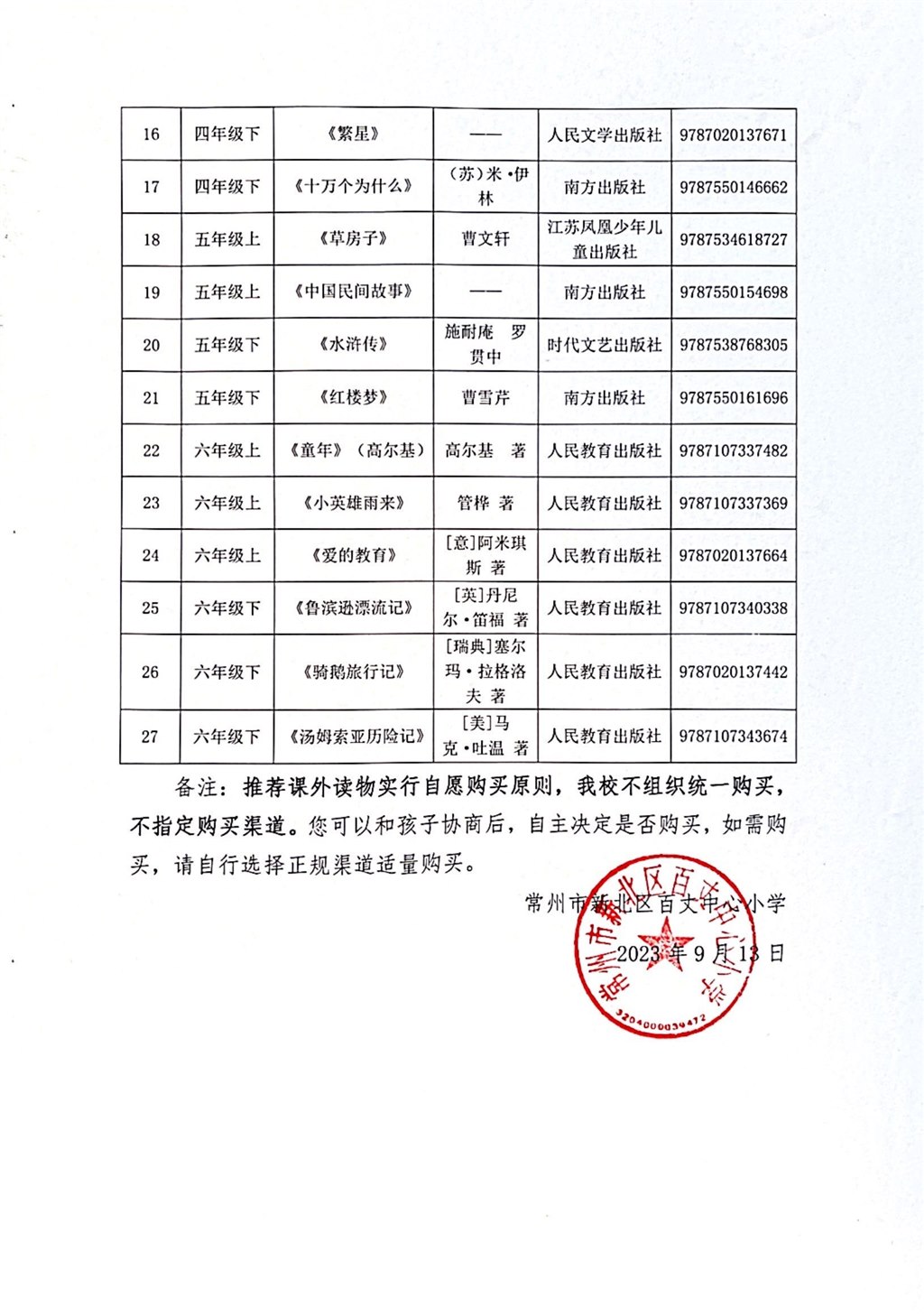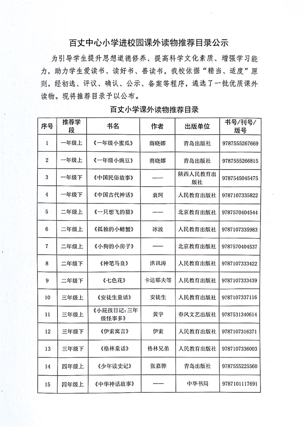 百丈中心小学进校园课外读物推荐目录公示