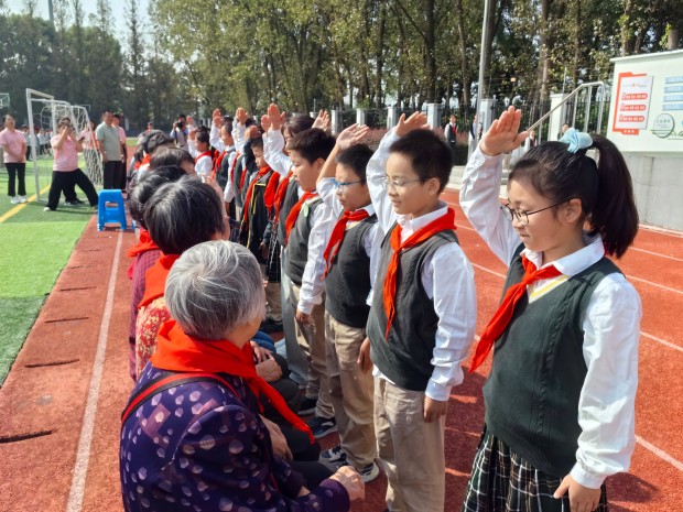 九九重阳节,感恩孝为先。重阳节这天百小也迎来了退休老教师们的到来,他们兢兢业业、无私奉献,为不断蓬勃发展的百小打下了坚实的基础。在小主持的带领下,全校少先队员们以及一年级学生对他们的到来表示了诚挚的欢迎,少先队员代表向老教师们敬献红领巾,戴上鲜艳的红领巾,他们脸上洋溢着幸福的笑容,整个操场老少同场,一片温馨静谧。