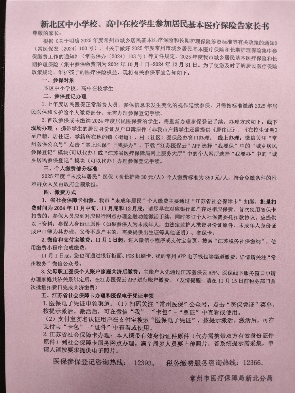 2025年新北区中小学、高中在校学生参加居民基本医疗保险告家长